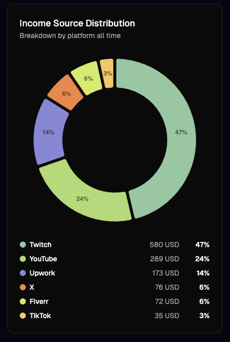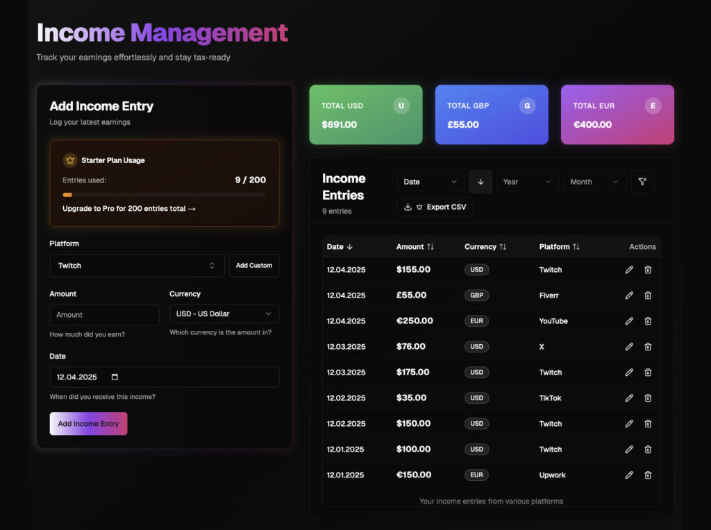- Manual income entry with pre-loaded platforms (e.g., YouTube, Twitch, Patreon) and custom platforms (custom is Pro).